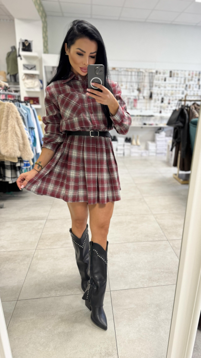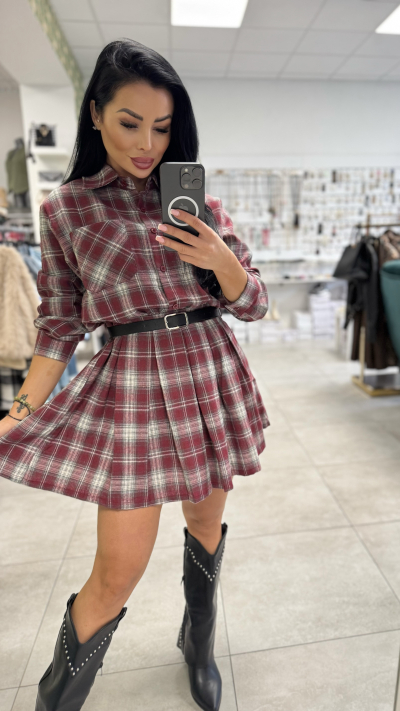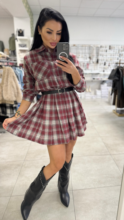 Kárované košeľové šaty s opaskom – vínovo-biele