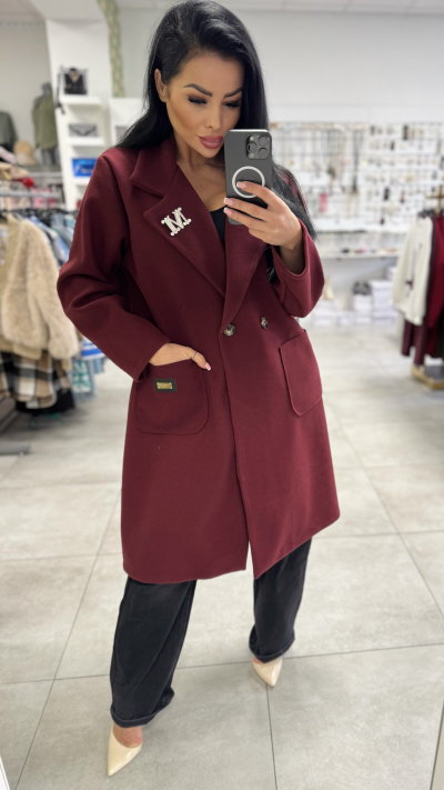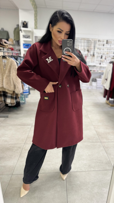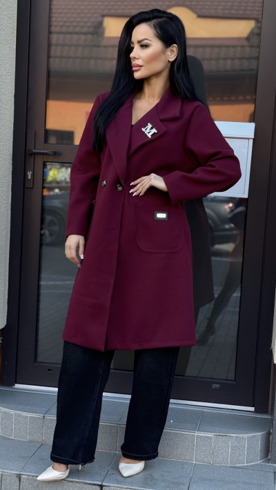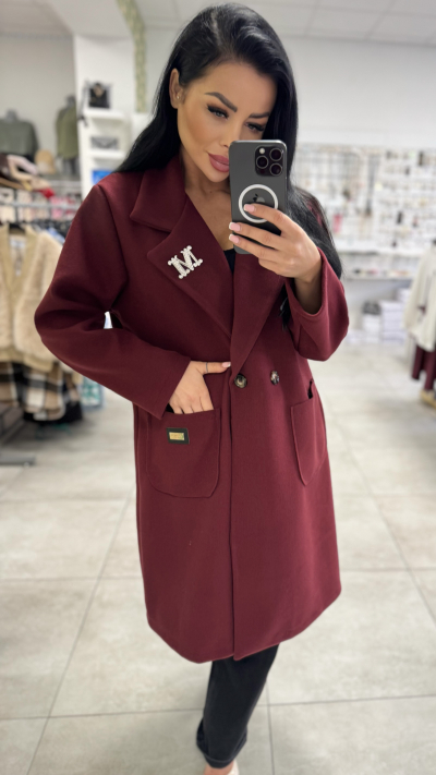 Dámsky, štýlový kabát v univerzálnej veľkosti. Kabát je v krásnej bordovej farbe. Perfektný kúsok vhodný do jesenného počasia. Kabát je voľného strihu, hodí sa perfektne na všetky typy postáv.