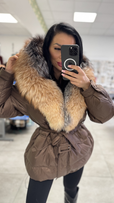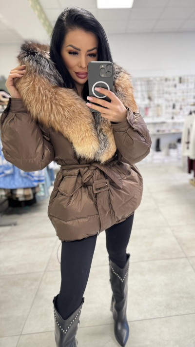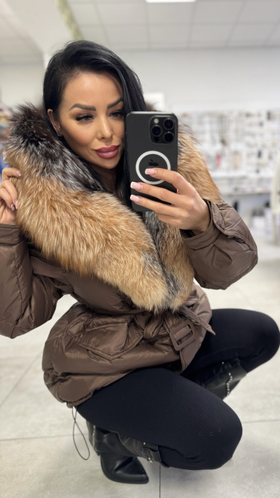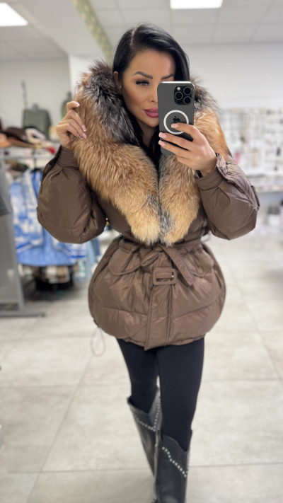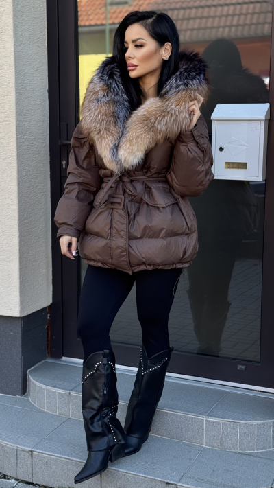 Dámska zimná bunda s kožušinou – hnedá elegancia Zahaľte sa do tepla a štýlu s touto luxusnou dámskou zimnou bundou. Kratší, prešívaný strih s viazaním v páse zvýrazní vašu postavu a dodá ženský vzhľad. Bohatý golier zdobený hustou kožušinou v prírodných odtieňoch hnedej, béžovej a čiernej pôsobí exkluzívne a elegantne. Detaily produktu: • Farba: hnedá • Strih: krátky, prešívaný, so sťahovacím opaskom v páse • Zapínanie: na zips a opasok s prackou • Golier: bohatá, odnímateľná kožušina • Materiál: kvalitný, hrejivý a vetruodolný • Vrecká: dve bočné • Štýl: elegantný, mestský, zimný Táto bunda je ideálnou voľbou pre modernú ženu, ktorá chce zostať v teple a zároveň pôsobiť štýlovo. Skvele sa kombinuje s úzkymi nohavicami, legínami alebo vysokými čižmami.