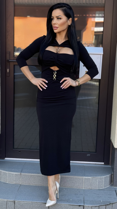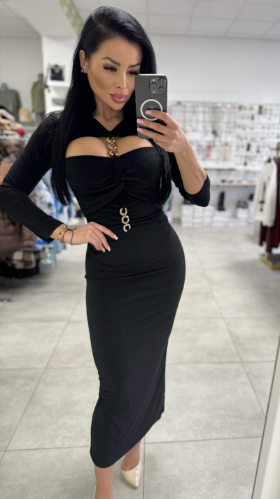 Štýlové dámske šaty v čiernom prevedení. Šaty sú s dlhým rukávov. Predná časť je tvorená výstrihom a zlatou dekoráciu. Veľmi vkusný sexy kúsok, ktorý sa hodí na rôzne príležitosti.