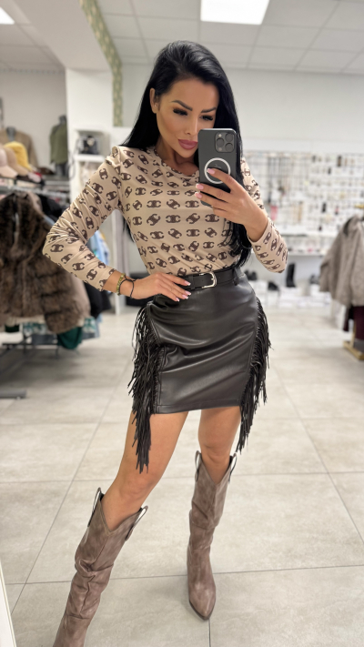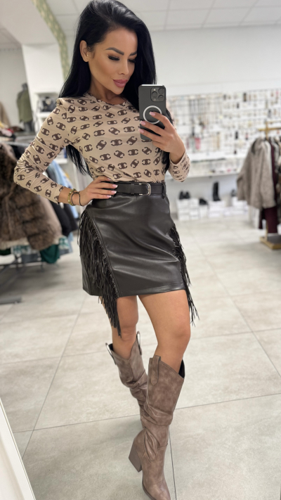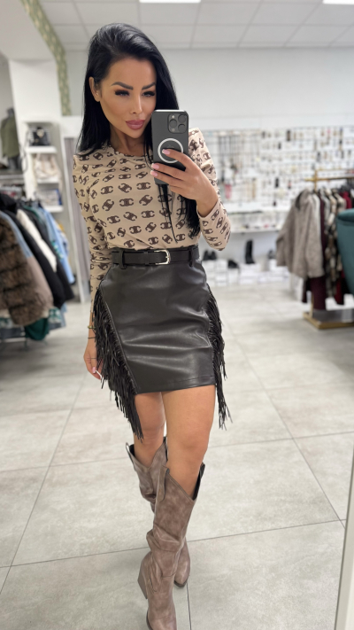 Moderná, dámska sukňa v sexy prevedení. Sukňa je v krásnej hnedej farbe. Súčasťou sukne je aj opasok. Perfektný kúsok vhodný na rôzne príležitosti. Strapce ju robia modernou a extravagantnou.