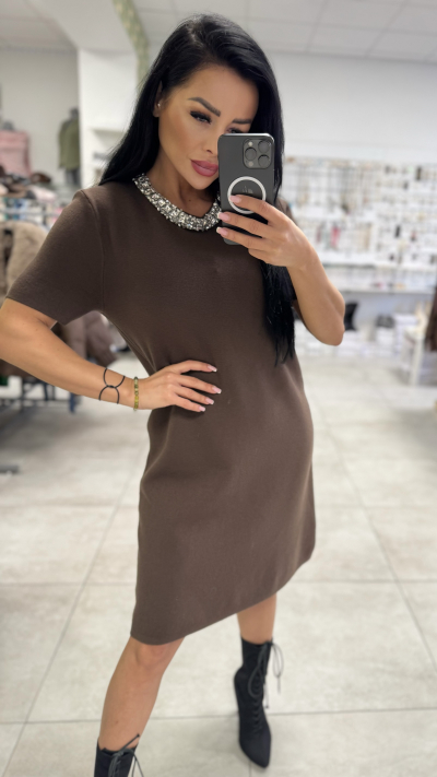 Šaty majú rovný strih, krátky rukáv a krásny zdobený výstrih s kamienkami, ktorý dodáva outfitu šmrnc a luxusný nádych.