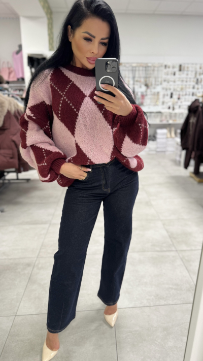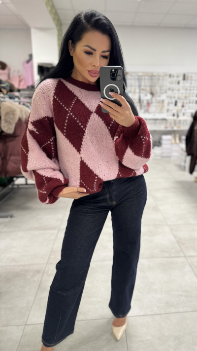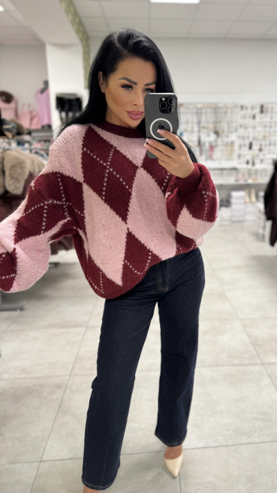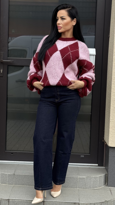 Dámsky pletený sveter s argyle vzorom – ružovo-bordový