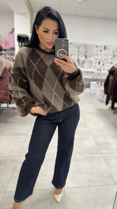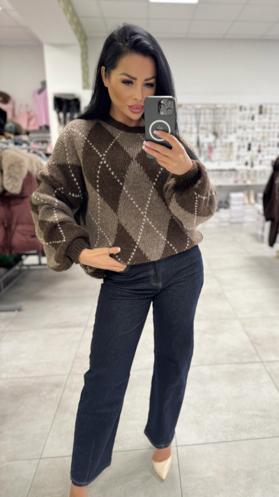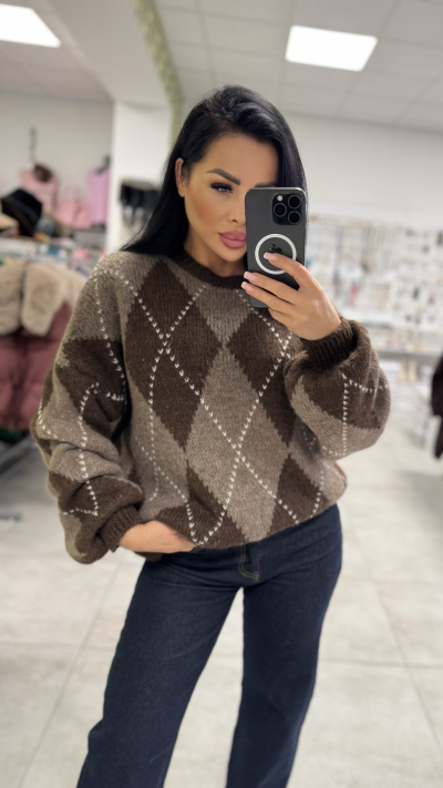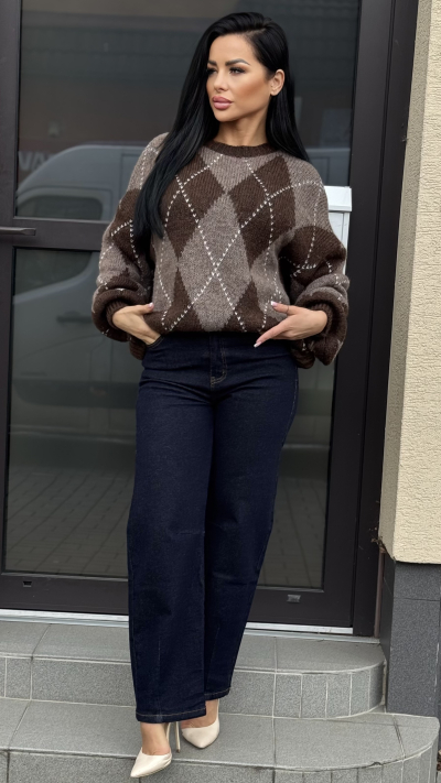 Dámsky pletený sveter s argyle vzorom – čokoládovo hnedý s béžový