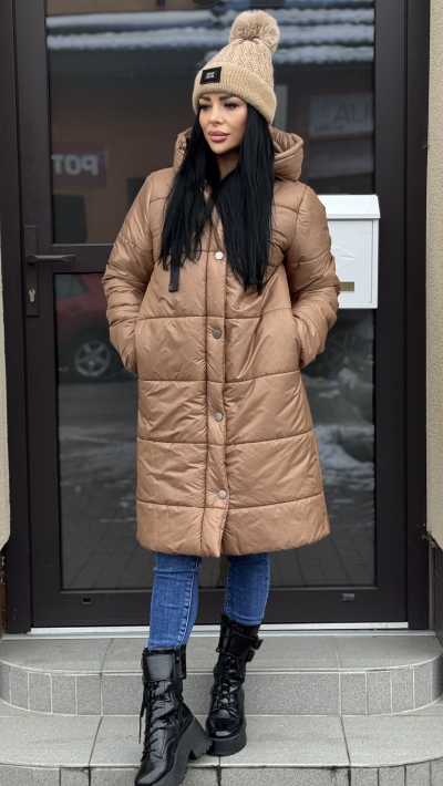 Dámska dlhá prešívaná zimná bunda – hnedá Objavte dokonalé spojenie pohodlia a štýlu s touto modernou dlhou prešívanou zimnou bundou v elegantnom hnedom odtieni. Bunda poskytuje výbornú tepelnú izoláciu, je ľahučká, príjemná na nosenie a navrhnutá tak, aby vás udržala v teple aj počas chladných zimných dní. Bunda má rovný, mierne oversize strih, ktorý sadne každej postave. Praktická kapucňa s vysokým golierom chráni pred vetrom a chladom. Zapínanie je riešené kombináciou zipsu a patentných gombíkov pre maximálne pohodlie a bezpečnú ochranu pred zimou. Po bokoch sa nachádzajú pohodlné bočné vrecká, ideálne na zahriatie rúk či odloženie drobností. Vlastnosti: • dlhá prešívaná zimná bunda • teplá, mäkká a veľmi pohodlná • kapucňa s vysokým golierom • zapínanie na zips + patentné gombíky • bočné vrecká • rovný, mierne oversize strih • moderný a univerzálny dizajn – vhodná do mesta aj na každodenné nosenie Materiál: • vrchný materiál: 100 % polyester • výplň: syntetické vlákno – teplé a ľahké • podšívka: polyester Dostupné veľkosti: S, M, L, XL