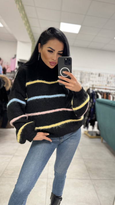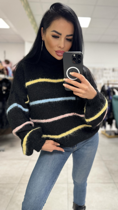 Dámsky rolákový sveter – čierny s farebnými pruhmi (UNI) Štýlový a výrazný rolákový sveter v čiernej farbe s jemnými farebnými pruhmi v žltej, ružovej a svetlomodrej. Tento kúsok je vyrobený z vysoko kvalitného, mäkkého a hrejivého materiálu, ktorý je príjemný na dotyk a komfortný na celodenné nosenie. Sveter má moderný oversize strih, dlhé rukávy a vyšší rolák, ktorý poskytuje maximálne teplo počas chladných dní. Farebné pruhy dodávajú sveteru mladistvý a svieži vzhľad. Univerzálna veľkosť sa prispôsobí rôznym typom postavy a krásne sadne na S až XL. ✔ UNIVERZÁLNA VEĽKOSŤ (UNI) Vhodný približne pre veľkosti S–XL. Materiál: vysokokvalitná mäkká pletenina Farby: čierna základ, žlté, ružové a modré pruhy Strih: oversize, rolák, dlhé rukávy Perfektný k rifliam aj sukni – teplý, pohodlný a štýlový kúsok, ktorý nesmie chýbať v zimnom šatníku.