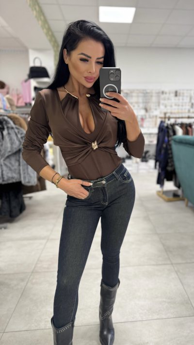 Elegantné dámske body s ozdobnou sponou – veľkosť UNI Štýlové dámske body v elegantnej hnedej farbe, ktoré krásne zvýrazní ženskú siluetu. Výstrih do V je efektným spôsobom doplnený zlatou ozdobnou sponou v prednej časti, ktorá dodáva modelu luxusný a sofistikovaný vzhľad. Jemné riasenie v oblasti dekoltu vytvára lichotivý efekt. Body má dlhé rukávy a je vyrobené z pružného, príjemného materiálu, vďaka čomu sa pohodlne prispôsobí postave. Skvelo drží tvar a perfektne sedí pod nohavice či sukňu – ideálne na elegantné aj večerné outfity. Detaily: • farba: hnedá • ozdobná zlatá spona v prednej časti • výstrih do V • dlhý rukáv • priliehavý strih • pružný a komfortný materiál Veľkosť: UNI (vhodná približne pre S–M, prípadne menšie L) Vhodné na: bežné nosenie, večerné príležitosti, oslavy, spoločenské udalosti, do práce aj na rande.