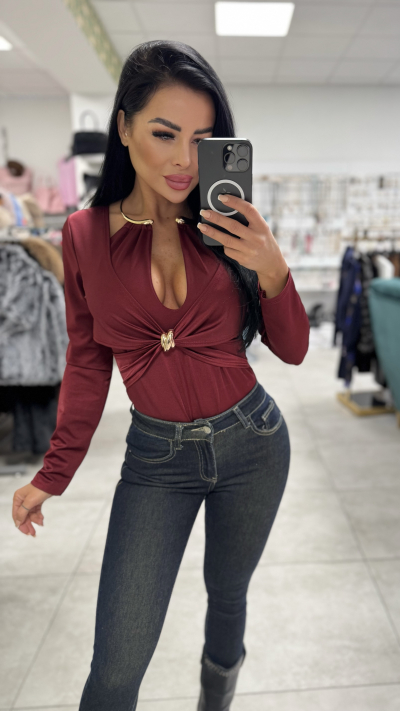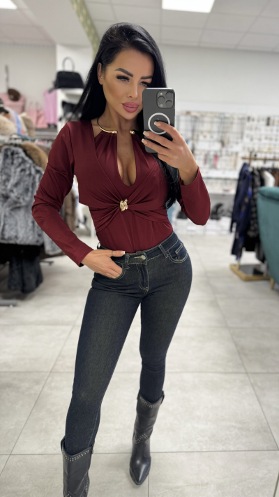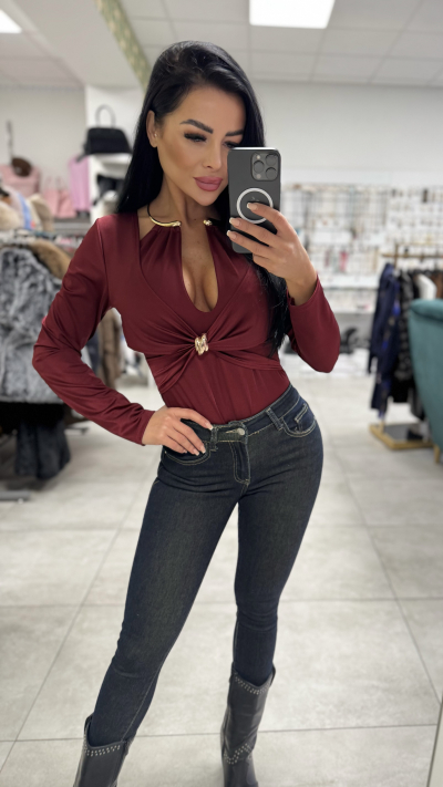 Elegantné dámske body s ozdobnou sponou – bordové | veľkosť UNI Štýlové dámske body v elegantnej bordovej farbe, ktoré nádherne zvýrazní ženskú siluetu. Výstrih do V je efektným spôsobom doplnený zlatou ozdobnou sponou v prednej časti, ktorá dodáva modelu luxusný a sofistikovaný vzhľad. Jemné riasenie v oblasti dekoltu vytvára lichotivý efekt. Body má dlhé rukávy a je vyrobené z pružného, príjemného materiálu, vďaka čomu sa pohodlne prispôsobí postave. Skvelo drží tvar a perfektne sedí pod nohavice či sukňu – ideálne na elegantné aj večerné outfity. Detaily: • farba: bordová • ozdobná zlatá spona v prednej časti • výstrih do V • dlhý rukáv • priliehavý strih • pružný a komfortný materiál Veľkosť: UNI (vhodná približne pre S–M, prípadne menšie L) Vhodné na: bežné nosenie, večerné príležitosti, oslavy, spoločenské udalosti, do práce aj na rande.