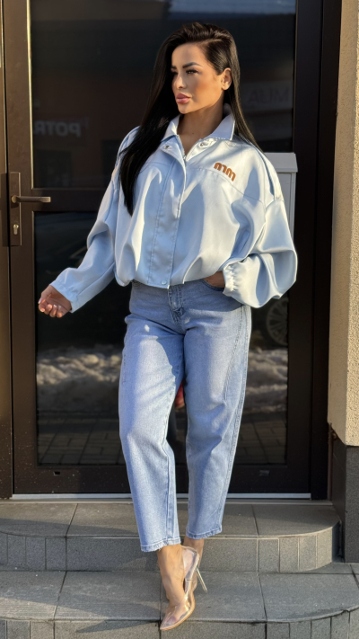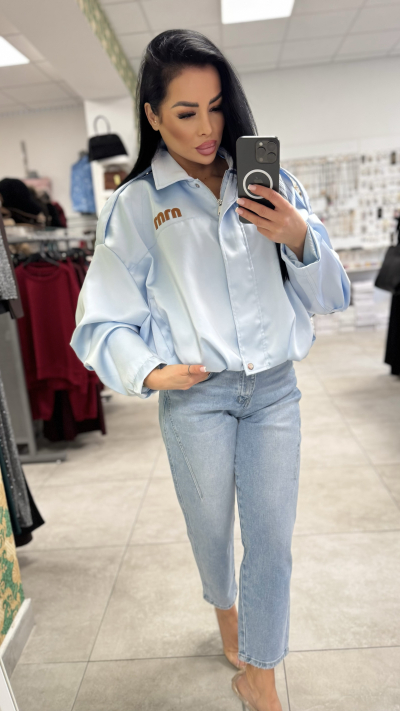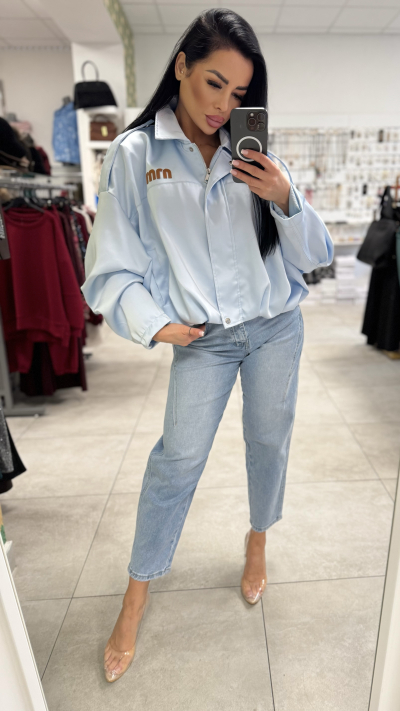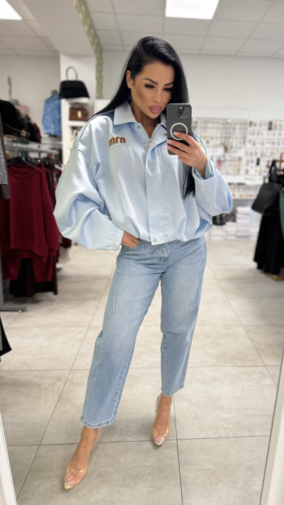 Štýlová, dámska bunda v bledomodrom prevedení. Bunda má zapínanie na zips. Je voľného strihu s dlhým rukávov. Moderný kúsok vhodný do jarného počasia.