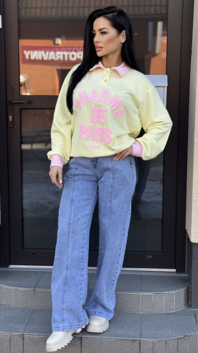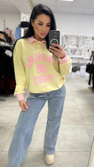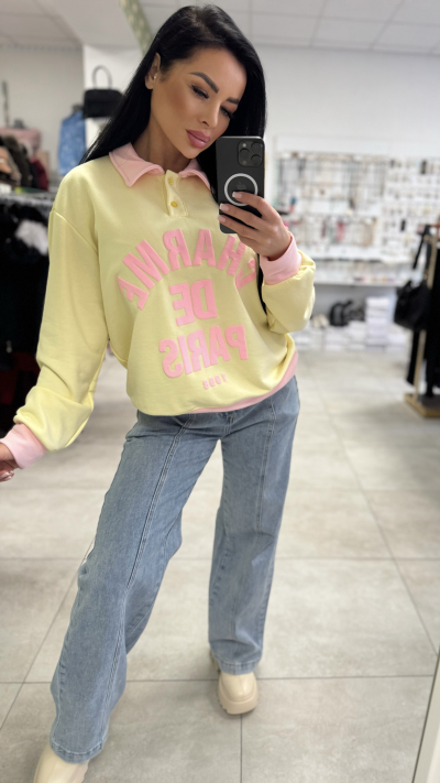Vkusná, dámska mikina v univerzálnej veľkosti. Mikina je zdobená límcom. Perfektný kúsok vhodný na bežné nosenie. Pohodlný materiál a voľný strih sú prednosti tohto kúsku.