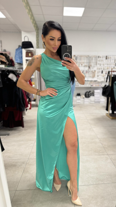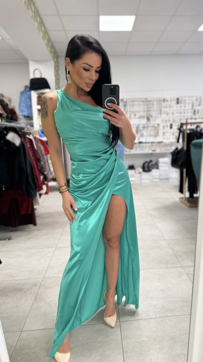 Elegantné saténové šaty na jedno rameno – smaragdová zelená Luxusné dlhé šaty z jemného saténového materiálu, ktoré zaujmú na prvý pohľad. Asymetrický strih na jedno rameno dodáva modelu moderný a ženský vzhľad, zatiaľ čo rafinované riasenie krásne zvýrazňuje siluetu. Vysoký rozparok na nohe pôsobí elegantne a zároveň zvodne. Ideálna voľba na spoločenské udalosti, svadby, plesy, večerné oslavy či formálne večere. Detaily produktu: • farba: smaragdová / tyrkysová zelená • strih: priliehavý, zvýrazňujúci postavu • výstrih: asymetrický – jedno rameno • materiál: jemný, lesklý satén • dĺžka: maxi • rozparok: vysoký bočný rozparok • zapínanie: skrytý zips • štýl: elegantný, spoločenský Model krásne ladí s lodičkami a výraznými doplnkami.