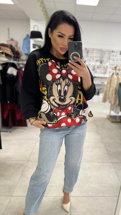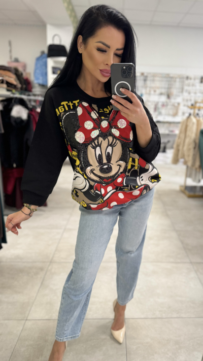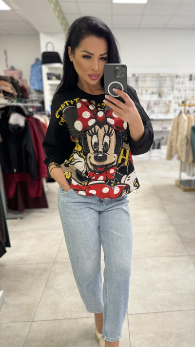 Štýlová oversize mikina s Minnie potlačou – UNI veľkosť Trendy mikina, ktorá oživí každý outfit výraznou potlačou Minnie. Voľný oversize strih zaručuje maximálne pohodlie pri nosení a zároveň pôsobí moderne a ležérne. Ideálna voľba na každodenné nosenie do mesta, na voľný čas aj na pohodlný štýlový look. Mikina má okrúhly výstrih, dlhé rukávy a je vyrobená z príjemného materiálu, ktorý je mäkký na dotyk. Dominantná farebná potlač na prednej strane dodáva mikine hravý, no zároveň výrazný charakter. Detaily produktu: • Oversize strih • Okrúhly výstrih • Dlhé rukávy • Výrazná Minnie potlač na prednej strane • Pohodlný, mäkký materiál • Farba: čierna s farebnou potlačou • Veľkosť: UNI (sadne S, M, L, XL) Perfektný kúsok k džínsom, legínam aj športovej obuvi pre pohodlný a štýlový outfit.