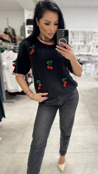 Štýlový, dámsky sveter univerzálne veľkosti. Sveter je zdobený 3-D čerešňami. Perfektný kúsok vhodný na jar.