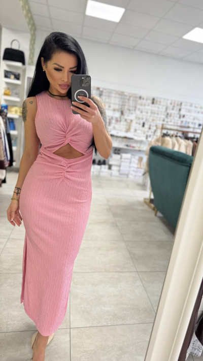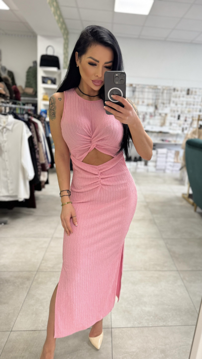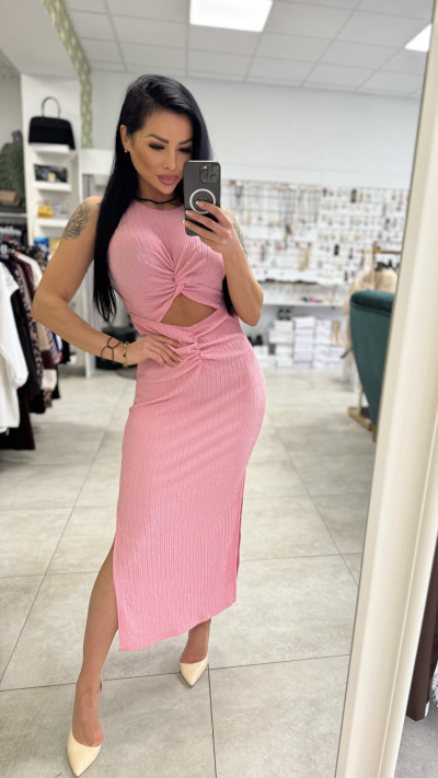 Ružové rebrované midi šaty s prestrihom Štýlové a ženské midi šaty, ktoré dokonale zvýraznia siluetu. Vyrobené z príjemného elastického rebrovaného materiálu, ktorý sa krásne prispôsobí postave a zabezpečí pohodlie počas celého dňa. Model má efektný uzol v oblasti pŕs a pásu, ktorý vytvára moderný prestrih a opticky zoštíhľuje postavu. Dĺžka pod kolená a bočný rozparok dodávajú šatám eleganciu a zároveň ženský, zvodný nádych. Krátky rukáv a priliehavý strih z nich robia ideálny kúsok na rôzne príležitosti – od oslavy, rande až po letnú párty. ✨ Detaily produktu: • Farba: ružová • Strih: priliehavý (bodycon) • Dĺžka: midi • Detail: prestrih v páse a na dekolte s riasením • Bočný rozparok • Elastický rebrovaný materiál Kombinujte s lodičkami pre elegantný look alebo so sandálmi pre ležérnejší štýl. Must-have kúsok, ktorý pritiahne pozornosť. ????