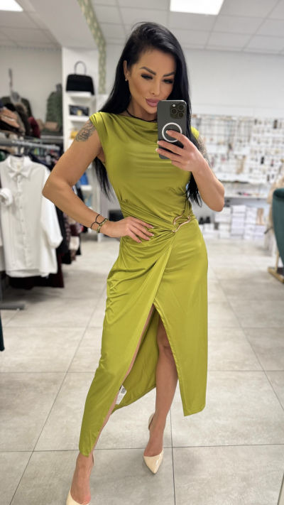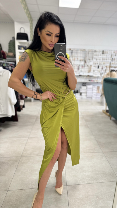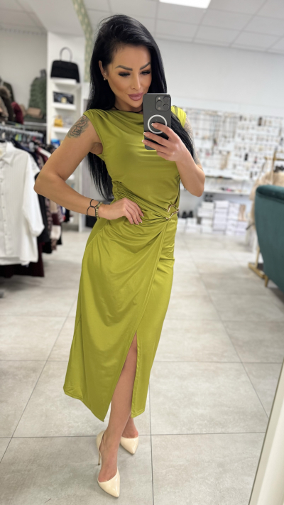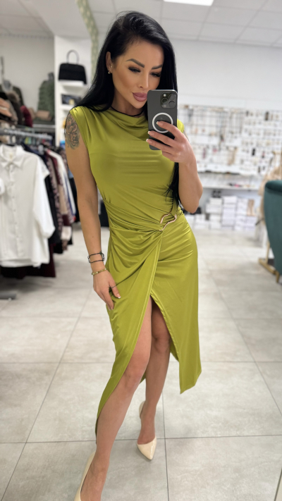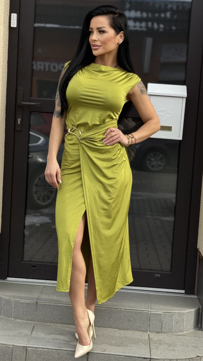 Zelené asymetrické midi šaty s riasením Elegantné a zároveň výrazné dámske midi šaty v trendy limetkovo-zelenej farbe, ktoré dokonale zvýraznia ženské krivky. Priliehavý strih krásne obopne postavu a jemne elastický materiál zabezpečí pohodlie počas celého dňa aj večera. Model je doplnený efektným riasením v oblasti pásu s ozdobnou kovovou aplikáciou, ktorá vytvára zaujímavý detail a opticky zoštíhľuje siluetu. Asymetricky riešená sukňa s prekladaným efektom a vyšším rozparkom dodáva šatám moderný a zvodný vzhľad. Jemne padnuté rukávy a elegantný, uzavretejší výstrih pôsobia sofistikovane. Ideálne na oslavy, svadby, večierky, rande alebo spoločenské udalosti, kde chcete zažiariť. ✨ Detaily produktu: • Farba: limetkovo zelená • Dĺžka: midi • Strih: priliehavý • Detail: riasenie v páse s kovovou aplikáciou • Asymetrická sukňa s rozparkom • Elastický, príjemný materiál Kombinujte s lodičkami pre elegantný look alebo so sandálmi na podpätku pre letný glamour štýl. ????