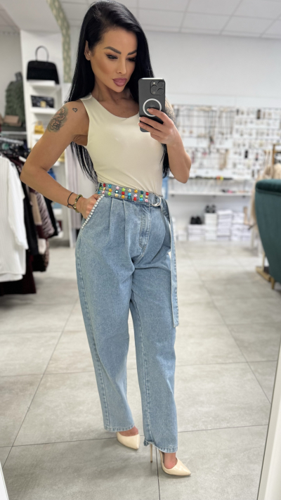 Nohavice majú pohodlný, mierne voľnejší strih s vysokým pásom a opaskom s farebnými detailmi, ktorý je súčasťou kompletu. Vďaka príjemnému denimovému materiálu sa komplet pohodlne nosí a zároveň perfektne drží tvar. Ideálny na bežné nosenie, do mesta aj na štýlové stretnutia.