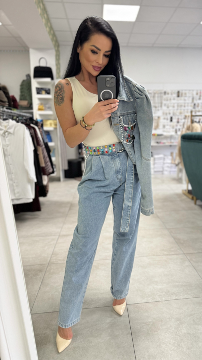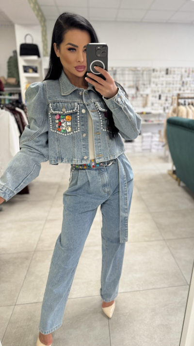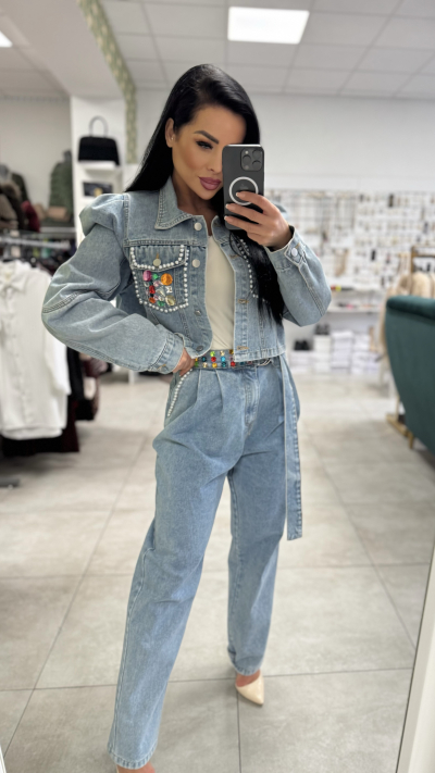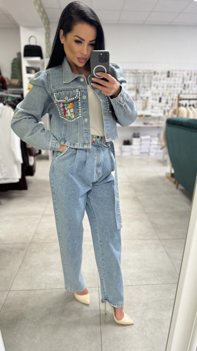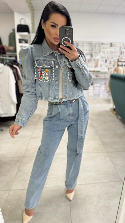 Moderný denimový set pozostáva z kratšej rifľovej bundy a nohavíc s vysokým pásom v rovnakom odtieni. Bunda má výrazné zdobené vrecká s perličkami a farebnými aplikáciami, ktoré dodávajú outfitu luxusný a originálny vzhľad. Zapínanie je na gombíky, strih je mierne skrátený a krásne zvýrazní pás.