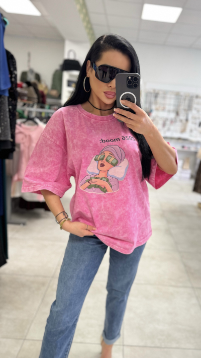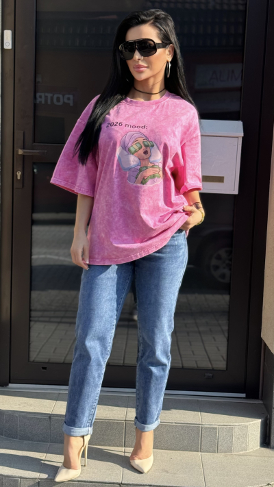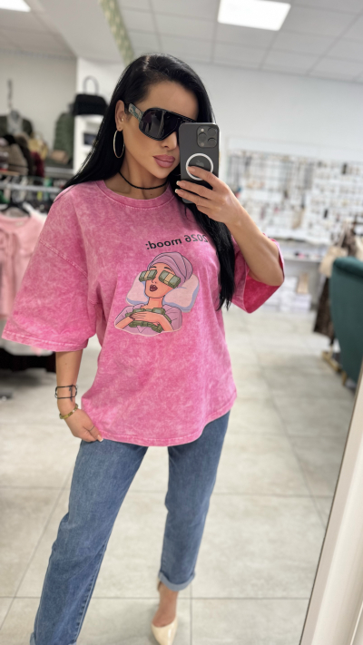 Štýlové dámske tričko v ružovom prevedení. Tričko je vyrobené z vysoko kvalitného materiálu. Perfektný kúsok vhodný na bežné nosenie.
