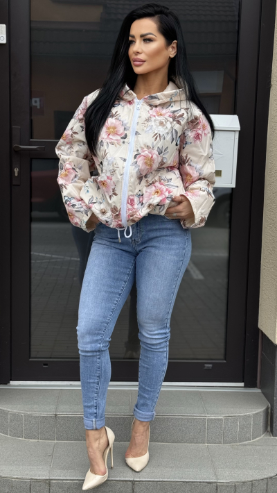 Dámska kvetinová prechodná bunda s kapucňou Štýlová dámska bunda s jemným kvetinovým vzorom, ktorá je ideálna na jarné a jesenné dni. Bunda zaujme romantickým dizajnom v svetlých farbách doplneným o výrazné kvety, vďaka čomu krásne oživí každý outfit. Má praktickú kapucňu, zapínanie na zips a pohodlný, mierne voľnejší strih, ktorý zabezpečuje komfort pri nosení. Ľahký materiál je príjemný na dotyk a vhodný na každodenné nosenie – či už do mesta, na prechádzku alebo na voľný čas. Bunda sa perfektne kombinuje s džínsami aj športovo-elegantnými outfitmi. Detaily produktu: • dámska prechodná bunda • romantický kvetinový vzor • zapínanie na zips • praktická kapucňa • pohodlný a moderný strih • ideálna na jar a jeseň • skvelo kombinovateľná s džínsami aj športovým outfitom
