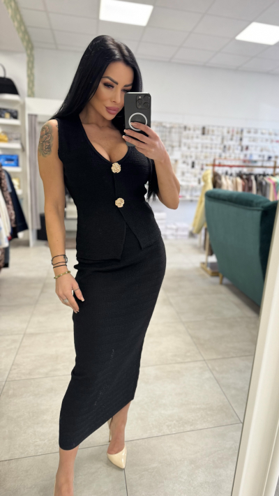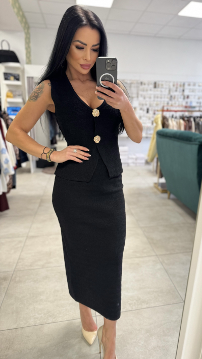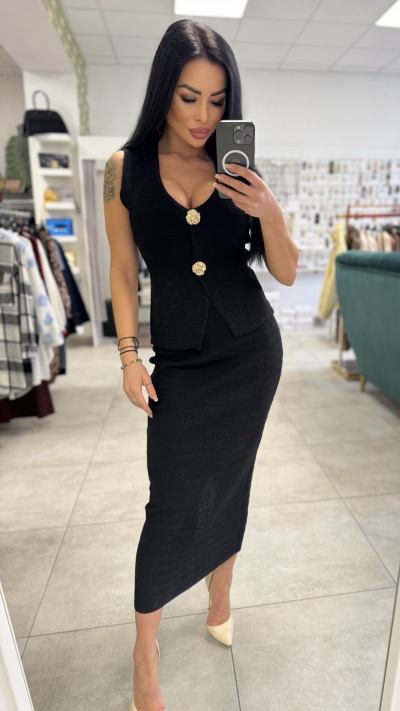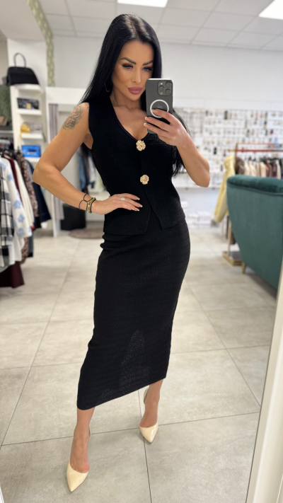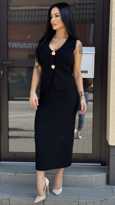 Elegantný dámsky komplet – vesta a sukňa v nadčasovej čiernej farbe, ktorý krásne zvýrazní ženskú siluetu. Set pozostáva z priliehavej midi sukne a štýlovej vesty bez rukávov s výraznými zlatými gombíkmi, ktoré dodávajú outfitu luxusný a sofistikovaný vzhľad. Materiál je príjemný, mierne elastický a pohodlný na nosenie.