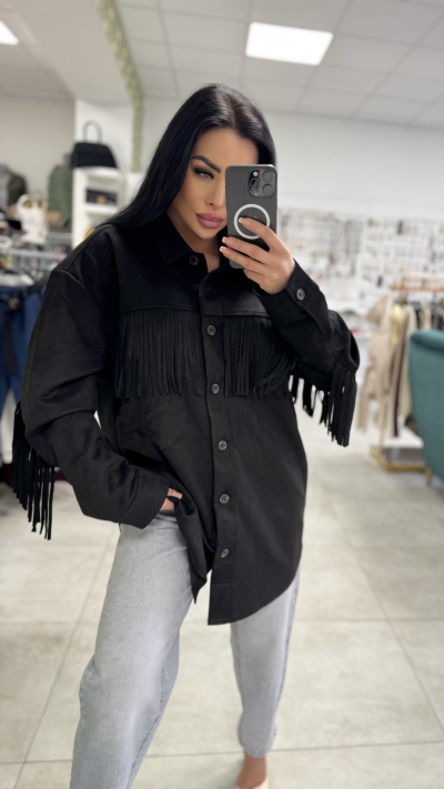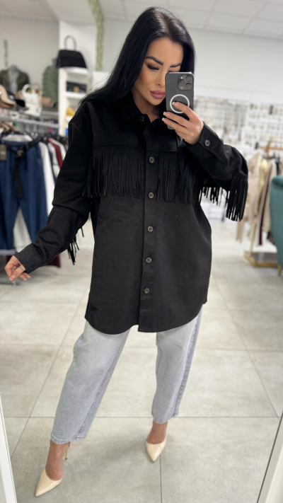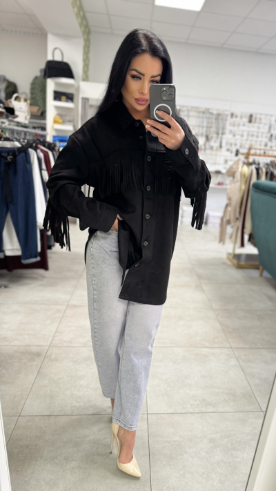 Štýlová prechodná bunda v trendy košeľovom strihu, ktorá skvele doplní každý outfit. Model je navrhnutý v minimalistickej čiernej farbe s výraznými strapcami na prednej časti a rukávoch, ktoré dodávajú celku moderný a originálny vzhľad.