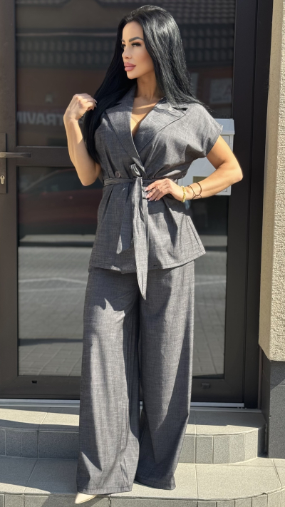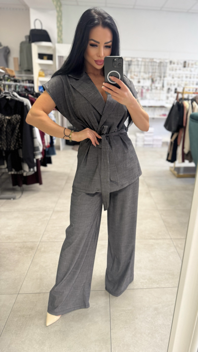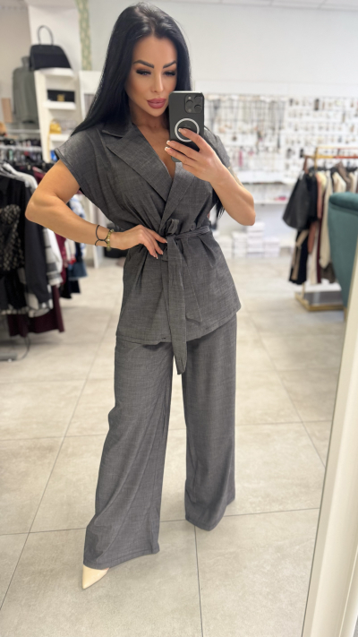 Elegantný a zároveň veľmi štýlový komplet v krásnom sivom prevedení. Komplet je v univerzálnej veľkosti. Nohavice sú páse na gumu. Vesta je s viazaním, čím si ju pekne prispôsobíte na postavu. Perfektný kúsok vhodný na slávnostné príležitosti