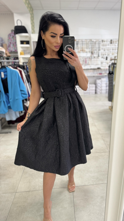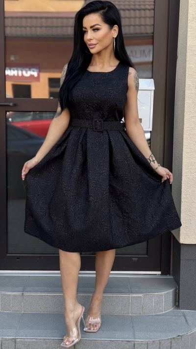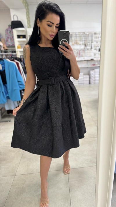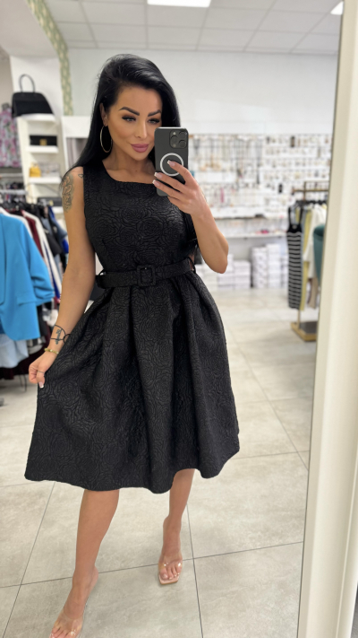 Vrchná časť je jednoduchá, bez rukávov, čo dodáva šatám čistý a sofistikovaný vzhľad. Sukňa je jemne rozšírená a pri pohybe pôsobí veľmi žensky. Výrazným prvkom je opasok s prackou, ktorý dodáva šatám eleganciu a dokonale formuje postavu.